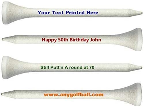 100 count Personalized 2 3/4″ white wooden Golf Tees Upload Your Own Text Prices Include Printing of personalization Customize golf Tees in different color ink with any message on 2 lines, up to 24 characters per line.. The more letters & lines used, the smaller the print will be. All lines will be centered Print Area: 3/8″ high x 1 3/8″ wide. We will size imprint as large as possible. Choose from 4 styles of Type